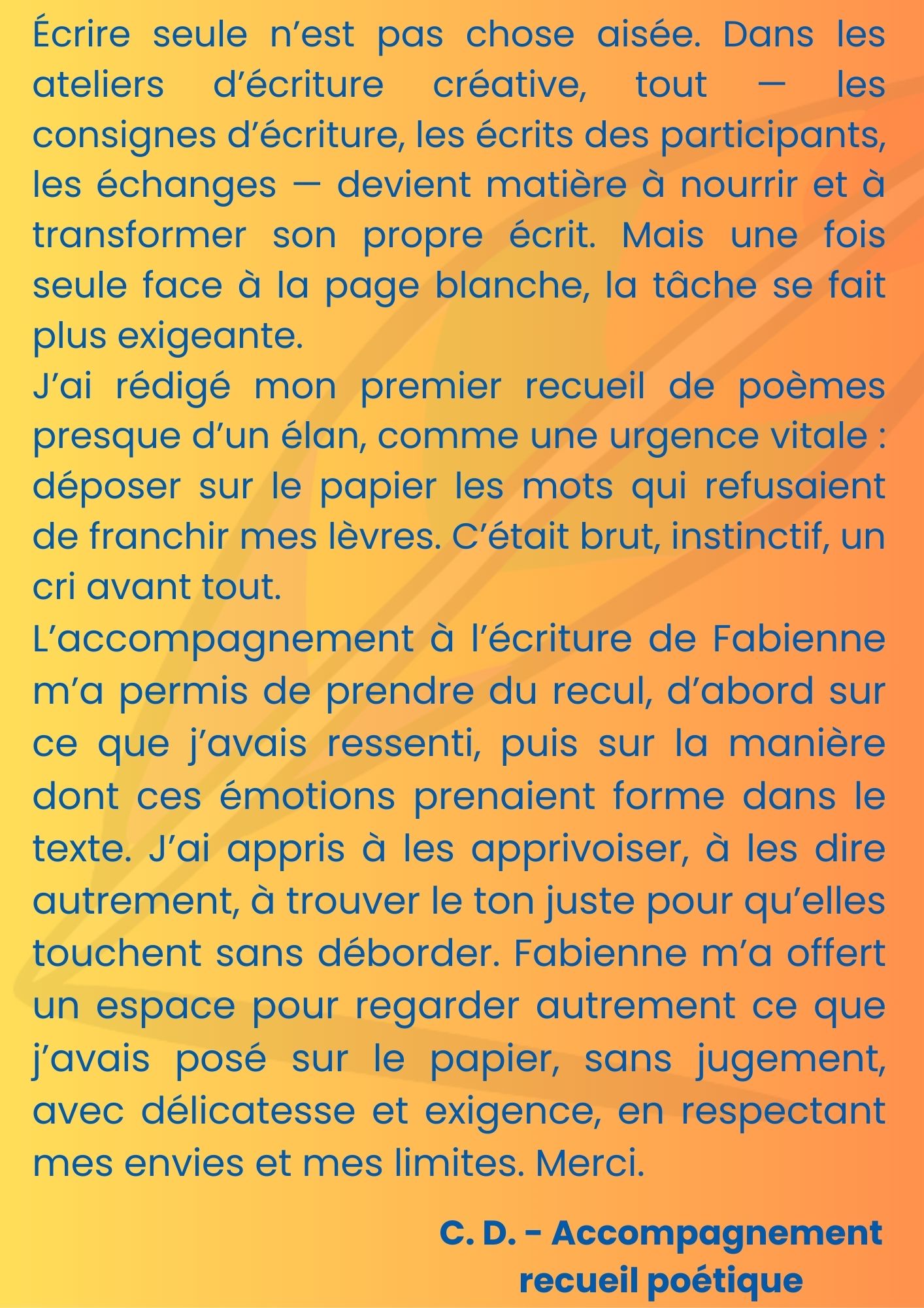 Dans une atmosphère bienveillante et conviviale, je formule des propositions d'écriture originales pour stimuler la créativité et favoriser les échanges et le partage.